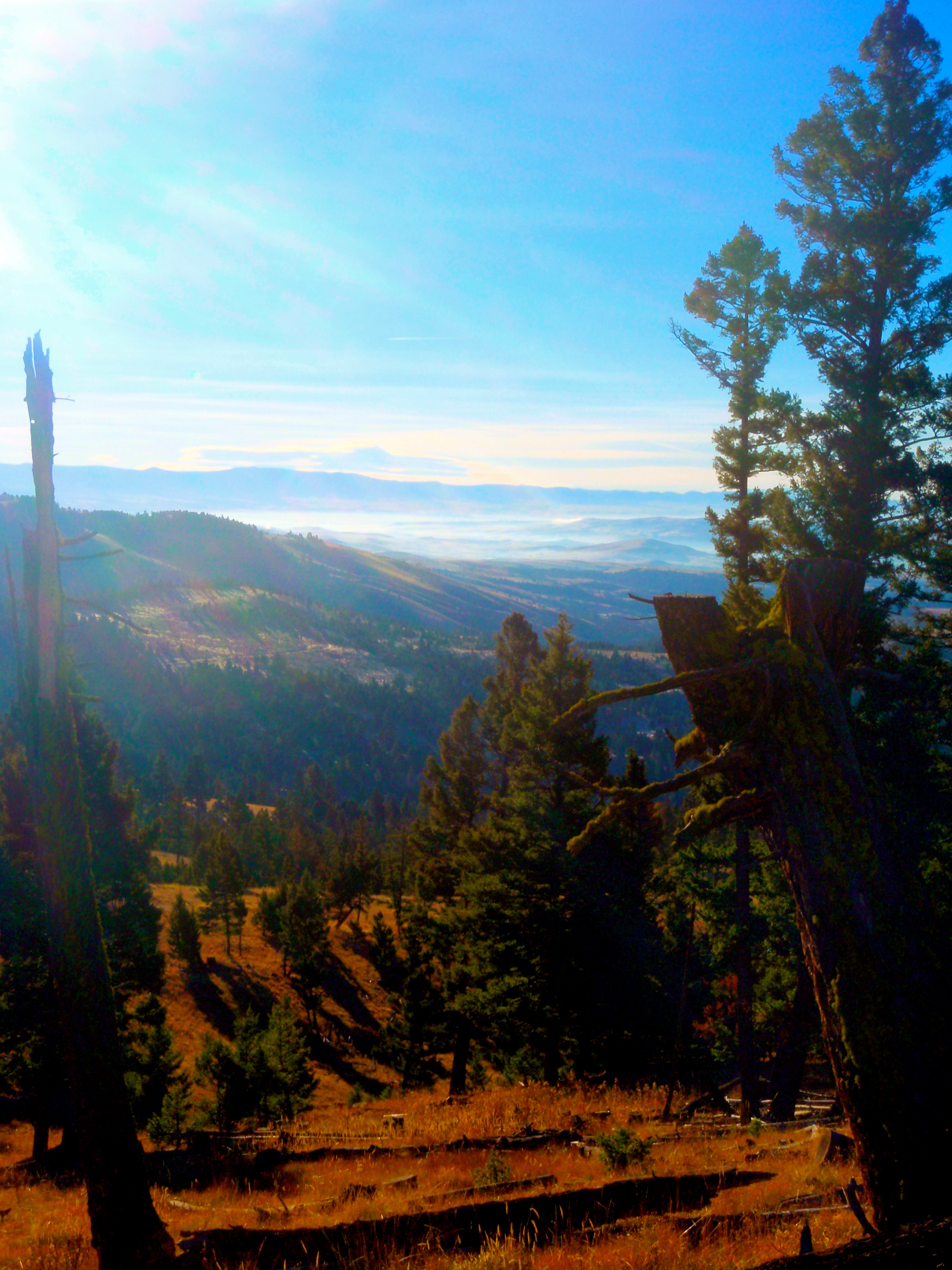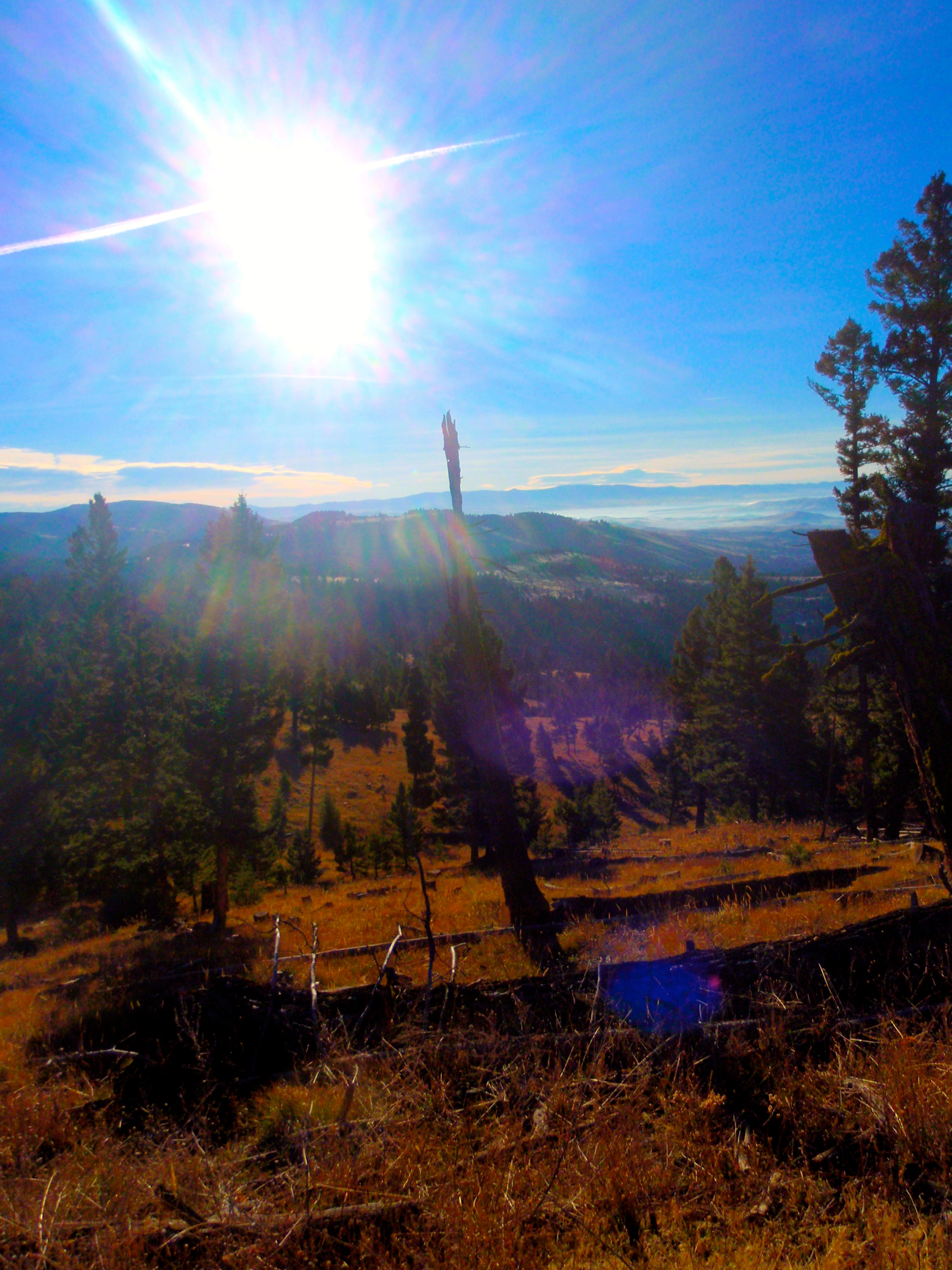 This tale takes place on the weekend of the Beaver Moon. I had never heard about a Beaver Moon until Tristan and I were headed up the mountain and I looked out my window to see a most gorgeous view of the full moon. I commented on how beautiful it was and Tristan told me what it was called. The first full moon in November is called the Beaver Moon because, it is the last full moon before the waters freeze over and the time has come to get your traps set out for winter. Last weekend found Tristan and I up on the Mountain at elk camp with the Mountain Man, Bill, Stoy, and Billy, once again matching wits with the clever elk. Raggedy Raghorn had been inspected by the local veterinarian and deemed unfit for consumption because of bacteria that had gone into the meat from his infected leg and gore wounds. Tristan had been issued a new tag by Montana Fish, Wildlife and Parks and along with my cow tag and the four other guys’ bull tags, we had quite the hunting crew. Stoy and Billy had come all the way from Indiana to hunt with their long time friends, The Mountain Man and Bill. The next morning found us out in the woods, staring at the moon again. We waited until the rays of sunlight started to lighten the sky, hinting of the coming of daybreak, to set out on a hike up to a high ridge top where elk sign had been previously spotted. The hike was invigorating and the view breathtaking…it could also be said that the hike was breathtaking and the view invigorating. My lungs always get a good workout at elk camp. We bumped a spike on our way to the top but no other elk were about. The hike ended in a small thicket of aspen interspersed with sage and pine. Three elk habitats combined into one created a picturesque and unique landscape.