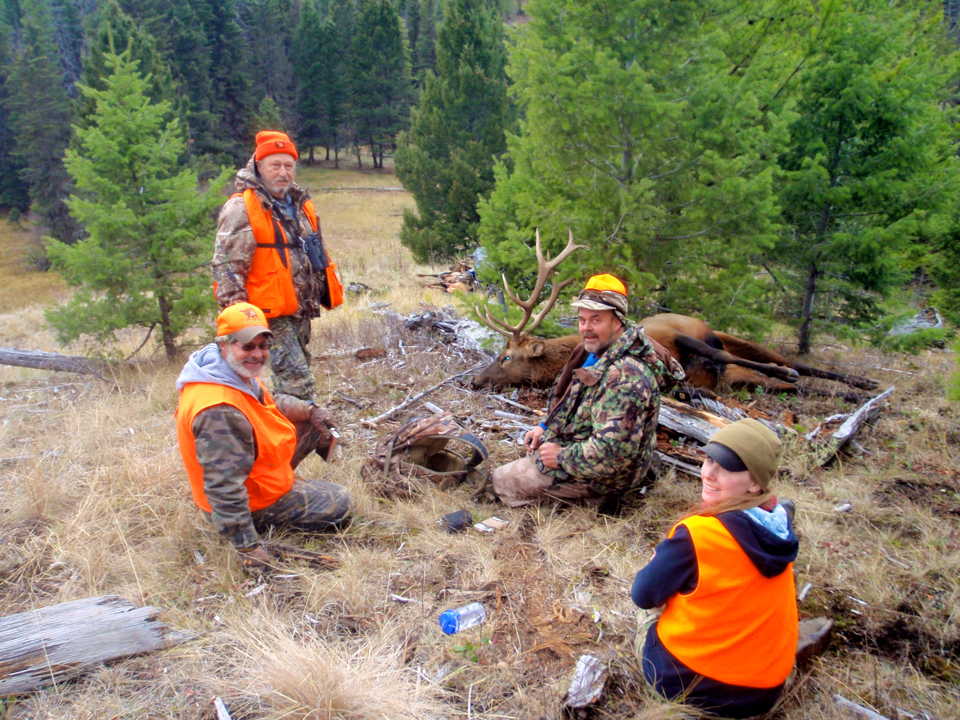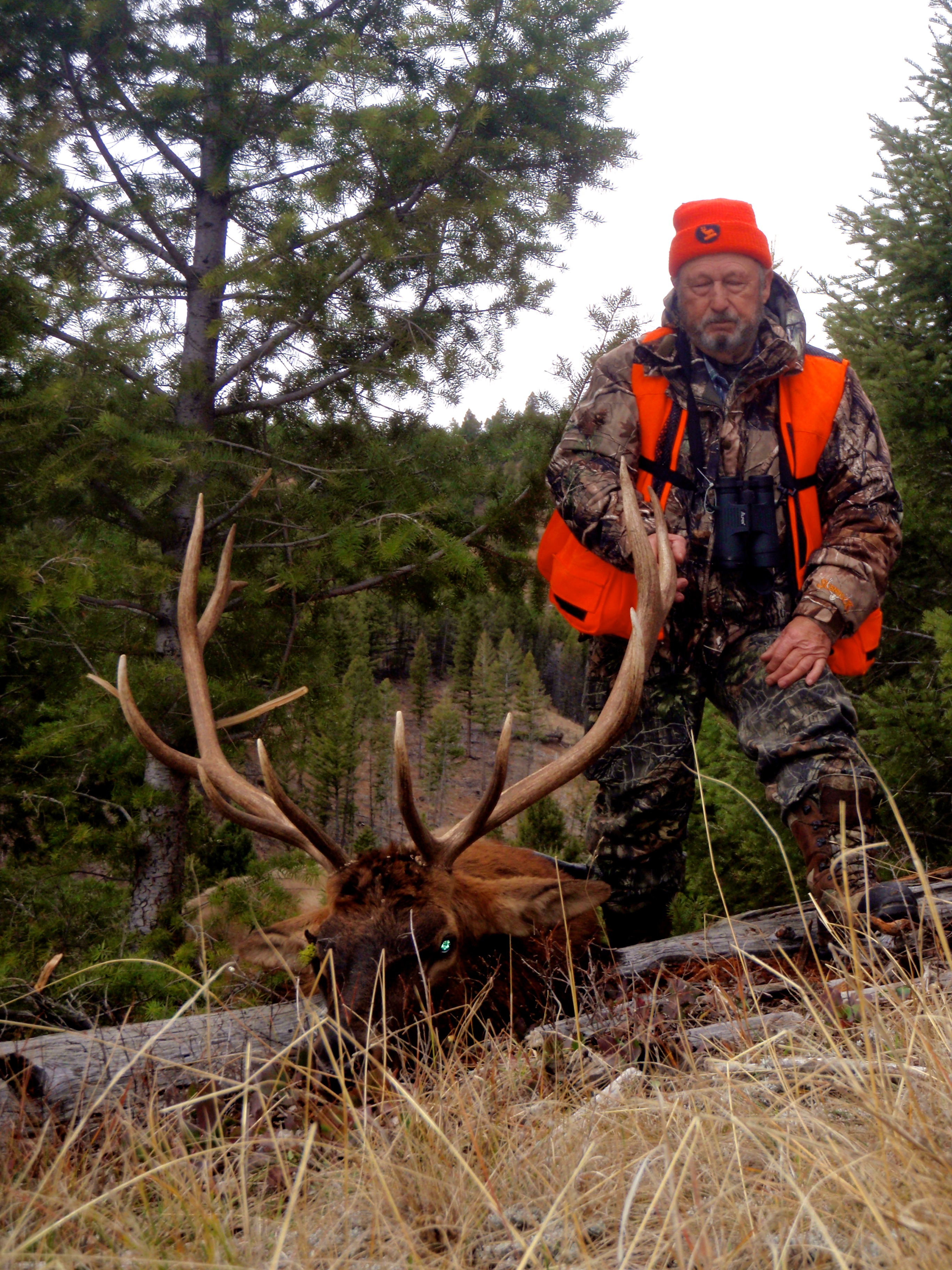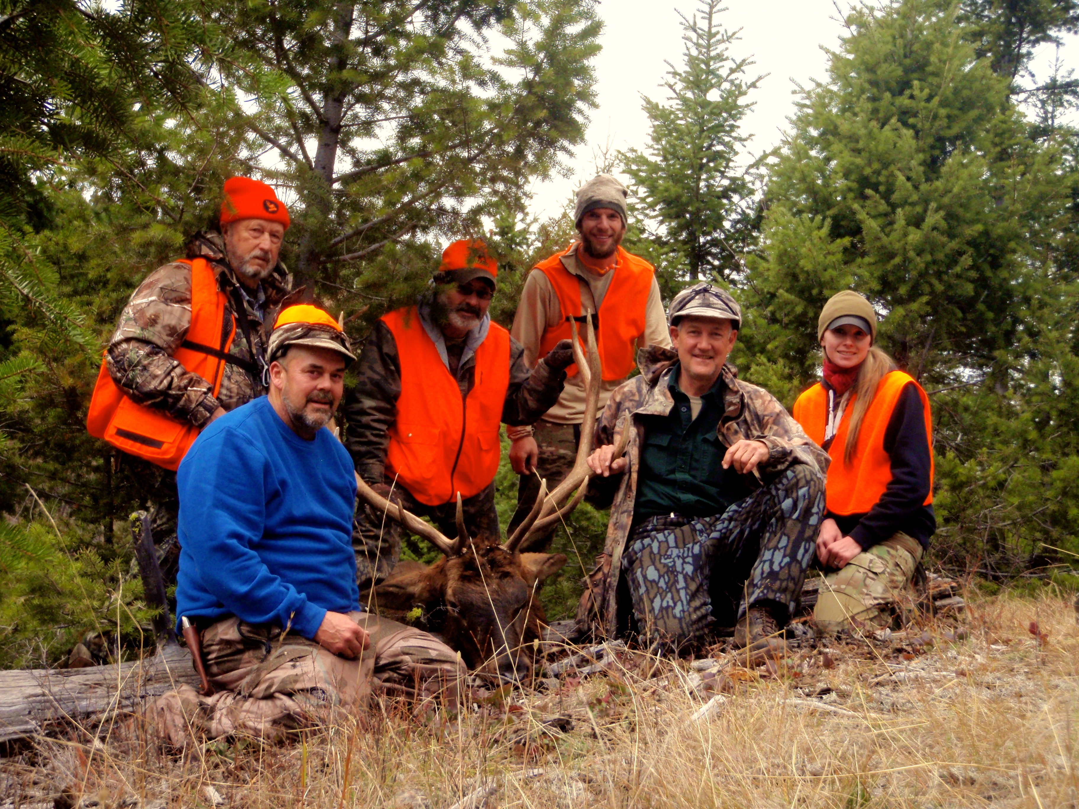 We made our way back down and headed to another area. The morning was spent this way and after a few unsuccessful ventures we decided to head back to camp. The truck was loaded up and we made our way to some standing dead timber for a load of firewood. It didn’t take long to get a full load with five of us working on it and we were soon back at camp getting ready for the evening hunt. Billy is a tough old timer who had knee replacement surgery just this summer. He wasn’t able to do a lot of hiking in this steep country so we decided to take to some of the logging roads and see what we could find. Stoy and Bill headed one way and Tristan, Billy and I headed another. We came to a vantage point that allowed for an amazing view of a lot of mountain country. We stopped to glass for awhile and while I was scanning the hillside I spotted what I thought were a couple of mule deer over a thousands yards away. The guys looked too and determined that they were stumps I had discovered. It wasn’t the first time I had glassed up a stump. I continued scanning and finally my glass rested on something I couldn’t ignore. The color just wasn’t right. I continued to stare at a spot, between two firs, that was the color of an elk. Finally the colors shifted and I was certain it was an elk. I alerted the guys and we began to watch him to determine what exactly we were looking at. It turned out to be a nice bull and as we watched, another even nicer bull stepped out of the young trees above. The sight of bulls was enough to get everyone pumped and excited. We were all wishing there was a simple way over to the bulls but they were 1500 yards away, as the crow flies, over steep draws and ridges. We had dwindling light at this point and knew that there was no way we would be able to intersect them before dark. The bulls didn’t seem to be headed anywhere, instead they calmly fed in a small park area near the top of a high ridge. We could only hope they would stay nearby until morning. We headed back to camp to come up with a plan. The situation was explained to the Mountain Man and the excitement we all felt was transferred to him as he came up with an idea for the morning. The Mountain Man knows elk. He knows their behavior patterns and he knows the mountain. That combination of knowledge makes you listen when he comes up with a plan. It will probably be your best chance to connect with a critter. We all went to bed hoping the elk were still grazing happily on that ridge top park. At dawn, the plan was carried out. We put Billy at the base of the ridge where a game trail proved that elk used it as a crossing point. We hoped that if we bumped the elk they would try to escape out the bottom and run right into Billy. Next, Tristan and I made our way around the ridge to the right as Stoy and Bill headed to the left. A fence ran from the left of the ridge all the way up to the top and back down on the right side, where Tristan and I were. The plan was to hit that fence line and follow it all the way to the top. There we would meet Stoy and Bill as they followed the fence up also. We hoped this would put us behind the elk if they were still in the park. We would then be able to sneak down into the park and hopefully get a shot. Whether we got a shot or not, we hoped that whatever happened would then send an unsuspecting bull barreling down the ridge to Billy. It was a detailed plan. It had many variables that could render it unsuccessful but we had to try. Working our way along the bunch grassy fence line was simple. Our GPS units are equipped with the Hunt Montana Chip from OnX Maps which made quick work of determining the property boundary line. We soon found ourselves very close to the top of the ridge. We hoped that Bill and Stoy were just on the other side and the elk were grazing oblivious below. We decided to split up a bit to cover more ground. I waited a few minutes to give Tristan a chance to crest the top of the hill before I started walking. I never got the chance. Only five minutes after we split up I heard three shots crack the silence like thunder. They were so close I knew it must be Tristan. I waited alert and watched to see if anything came my way. A short two minutes later a faint shot was heard. It seemed to come from the direction of Billy. My heart almost jumped out of my chest and a quick prayer left my lips, “Oh God, I hope that was Billy!” I decided to head to where I heard Tristan shoot. I spotted him up the hill and he motioned me to climb up as well. He met me halfway up and I asked if he had shot. He said, “Yeah. Come check out this bull I have down!”. Bill and Stoy had bumped the bigger bull, without knowing it, as they came up the ridge. The bull escaped out of some small timber and ran right toward Tristan. Suddenly, the bull became aware of Tristan’s dangerous presence and turned. Three well placed shots from the lever action finished his story in the middle of that ridge top park. I was so excited and happy for him as I ran my hands along the beautiful six point antlers. The smooth ivory tips felt like success under my fingers. His last bull elk he had taken had been such a fun hunt and experience but had ended up as a sad experience as well when the meat was deemed unfit to eat and the bull was handed over to Montana FWP. This bull looked like a horse laying there. He was an obviously, extremely healthy bull and our freezer was about to fill back up once again. Tristan had truly gone from rags to riches when he traded up. What a blessing. We were quickly joined by Bill and Stoy. High fives and hugs filled the hilltop as smiles brightened the landscape and clouds filled the sky. Weather was coming and it didn’t look friendly.