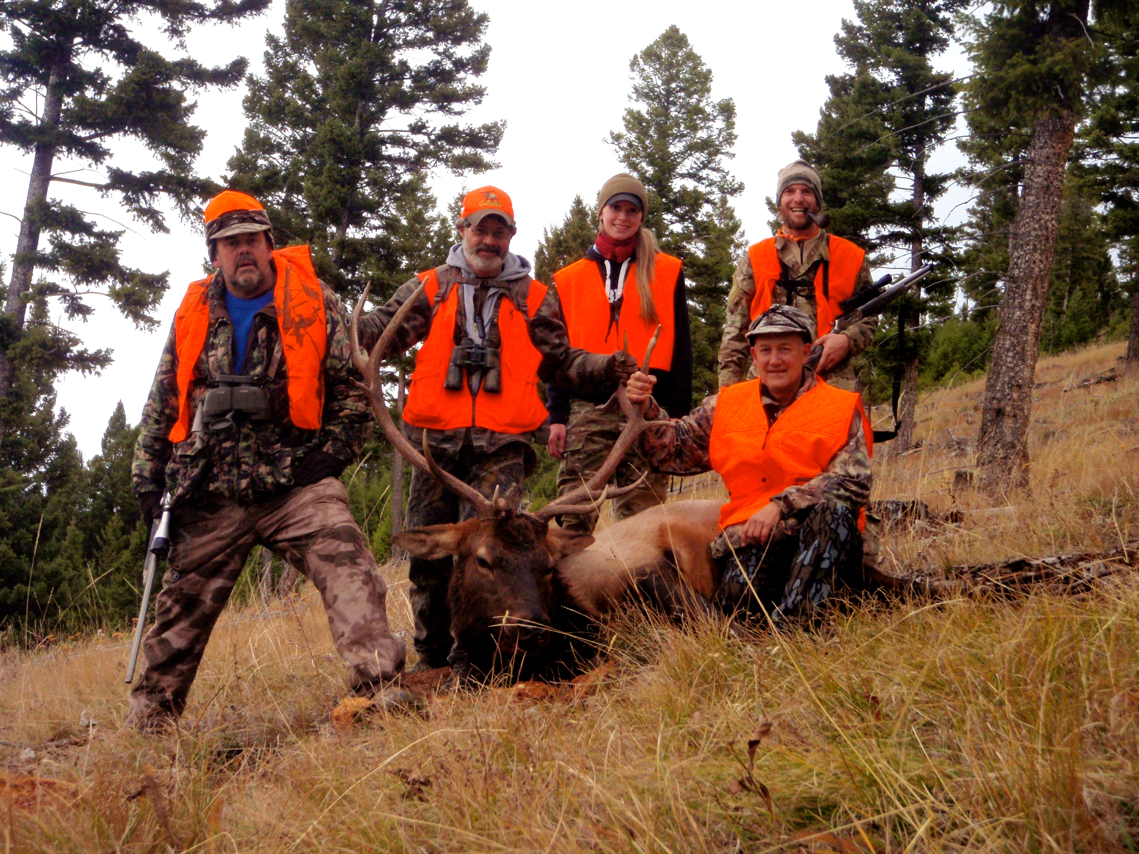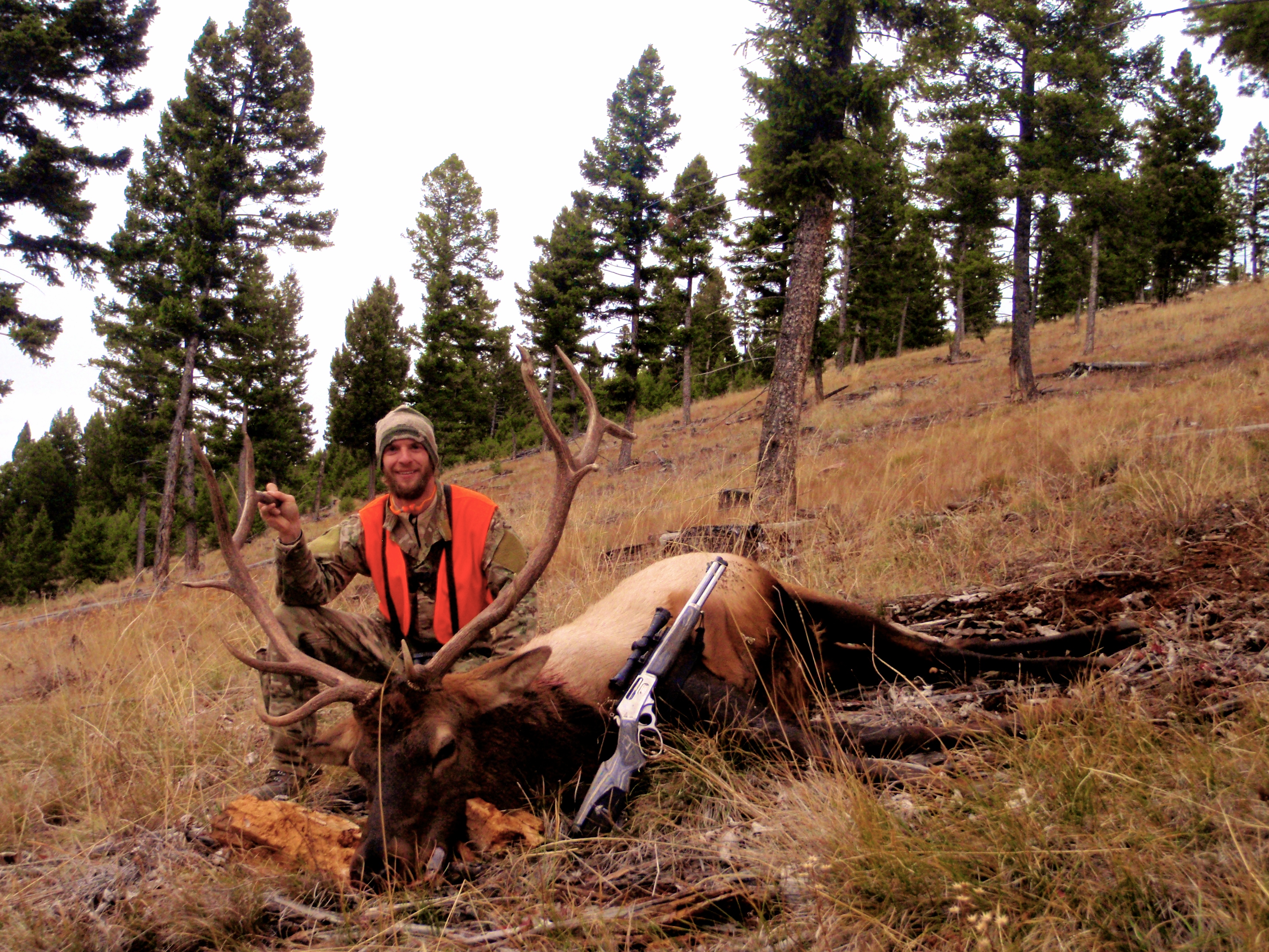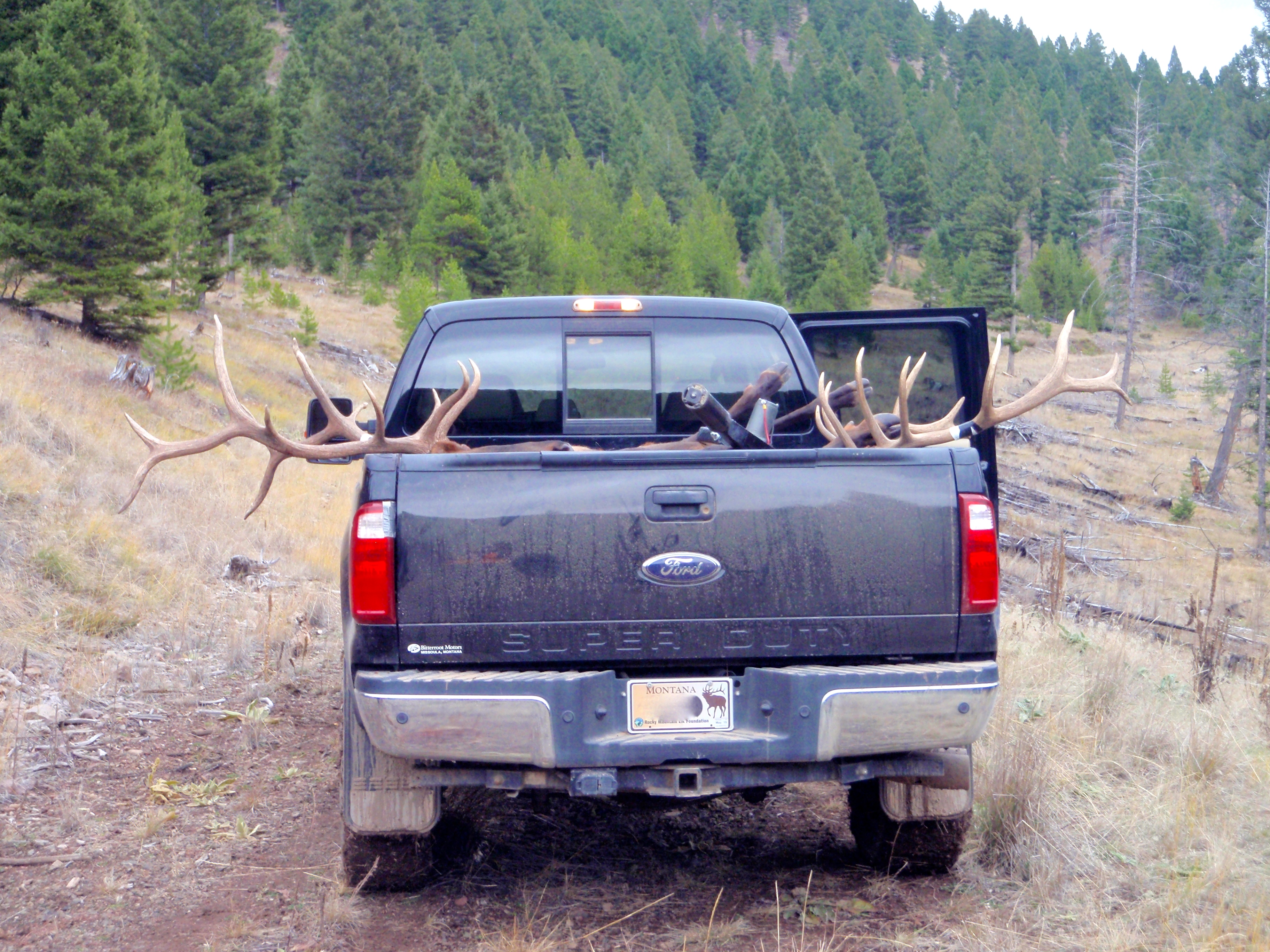 We made our way back down and headed to another area. The morning was spent this way and after a few unsuccessful ventures we decided to head back to camp. The truck was loaded up and we made our way to some standing dead timber for a load of firewood. It didn’t take long to get a full load with five of us working on it and we were soon back at camp getting ready for the evening hunt. Billy is a tough old timer who had knee replacement surgery just this summer. He wasn’t able to do a lot of hiking in this steep country so we decided to take to some of the logging roads and see what we could find. Stoy and Bill headed one way and Tristan, Billy and I headed another. We came to a vantage point that allowed for an amazing view of a lot of mountain country. We stopped to glass for awhile and while I was scanning the hillside I spotted what I thought were a couple of mule deer over a thousands yards away. The guys looked too and determined that they were stumps I had discovered. It wasn’t the first time I had glassed up a stump. I continued scanning and finally my glass rested on something I couldn’t ignore. The color just wasn’t right. I continued to stare at a spot, between two firs, that was the color of an elk. Finally the colors shifted and I was certain it was an elk. I alerted the guys and we began to watch him to determine what exactly we were looking at. It turned out to be a nice bull and as we watched, another even nicer bull stepped out of the young trees above. The sight of bulls was enough to get everyone pumped and excited. We were all wishing there was a simple way over to the bulls but they were 1500 yards away, as the crow flies, over steep draws and ridges. We had dwindling light at this point and knew that there was no way we would be able to intersect them before dark. The bulls didn’t seem to be headed anywhere, instead they calmly fed in a small park area near the top of a high ridge. We could only hope they would stay nearby until morning. We headed back to camp to come up with a plan. The situation was explained to the Mountain Man and the excitement we all felt was transferred to him as he came up with an idea for the morning. The Mountain Man knows elk. He knows their behavior patterns and he knows the mountain. That combination of knowledge makes you listen when he comes up with a plan. It will probably be your best chance to connect with a critter. We all went to bed hoping the elk were still grazing happily on that ridge top park. At dawn, the plan was carried out. We put Billy at the base of the ridge where a game trail proved that elk used it as a crossing point. We hoped that if we bumped the elk they would try to escape out the bottom and run right into Billy. Next, Tristan and I made our way around the ridge to the right as Stoy and Bill headed to the left. A fence ran from the left of the ridge all the way up to the top and back down on the right side, where Tristan and I were. The plan was to hit that fence line and follow it all the way to the top. There we would meet Stoy and Bill as they followed the fence up also. We hoped this would put us behind the elk if they were still in the park. We would then be able to sneak down into the park and hopefully get a shot. Whether we got a shot or not, we hoped that whatever happened would then send an unsuspecting bull barreling down the ridge to Billy. It was a detailed plan. It had many variables that could render it unsuccessful but we had to try. Working our way along the bunch grassy fence line was simple. Our GPS units are equipped with the Hunt Montana Chip from OnX Maps which made quick work of determining the property boundary line. We soon found ourselves very close to the top of the ridge. We hoped that Bill and Stoy were just on the other side and the elk were grazing oblivious below. We decided to split up a bit to cover more ground. I waited a few minutes to give Tristan a chance to crest the top of the hill before I started walking. I never got the chance. Only five minutes after we split up I heard three shots crack the silence like thunder. They were so close I knew it must be Tristan. I waited alert and watched to see if anything came my way. A short two minutes later a faint shot was heard. It seemed to come from the direction of Billy. My heart almost jumped out of my chest and a quick prayer left my lips, “Oh God, I hope that was Billy!” I decided to head to where I heard Tristan shoot. I spotted him up the hill and he motioned me to climb up as well. He met me halfway up and I asked if he had shot. He said, “Yeah. Come check out this bull I have down!”. Bill and Stoy had bumped the bigger bull, without knowing it, as they came up the ridge. The bull escaped out of some small timber and ran right toward Tristan. Suddenly, the bull became aware of Tristan’s dangerous presence and turned. Three well placed shots from the lever action finished his story in the middle of that ridge top park. I was so excited and happy for him as I ran my hands along the beautiful six point antlers. The smooth ivory tips felt like success under my fingers. His last bull elk he had taken had been such a fun hunt and experience but had ended up as a sad experience as well when the meat was deemed unfit to eat and the bull was handed over to Montana FWP. This bull looked like a horse laying there. He was an obviously, extremely healthy bull and our freezer was about to fill back up once again. Tristan had truly gone from rags to riches when he traded up. What a blessing. We were quickly joined by Bill and Stoy. High fives and hugs filled the hilltop as smiles brightened the landscape and clouds filled the sky. Weather was coming and it didn’t look friendly.