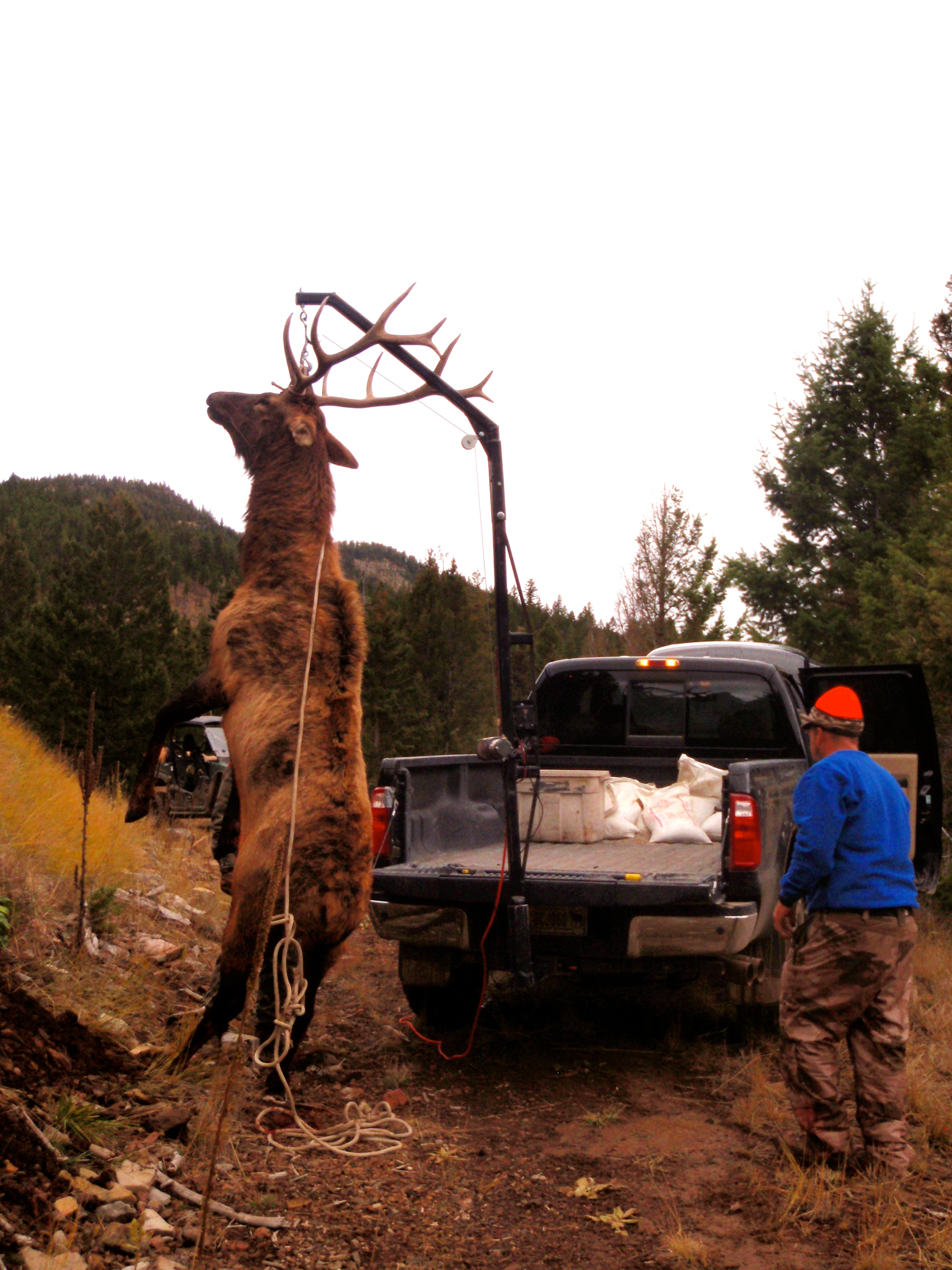 Hugs were once again passed all around and we listened as Billy told of the bull running down the hill and pausing in the only little opening ahead. Billy turned on his shooting sticks and shot in that split second he had before the bull took back off. He didn’t know if he had even hit the bull until he walked up there and found him dead. A perfect lung shot put him down after only a few yards. I sat there in awe. How did it happen? How did such a detailed plan, made on such variables, come to fruition exactly as it was planned? This never happens. The experience and wisdom of the Mountain Man was made evident right before my eyes. It was just meant to be and I was thankful to have been there to see it. What an amazing experience and a hunt none of us will forget. The field work was completed on Billy’s bull and we were able to get Bill’s truck, with a lift, close enough to load both bulls into for the trip back to camp. The timing couldn’t have been better…the drops that would soon turn to snow began to hit my cheeks as I walked into the cabin. The wind began to toss about the fir tree limbs like waves in the storm tossed sea but we were back at camp with two bulls hanging in the barn.