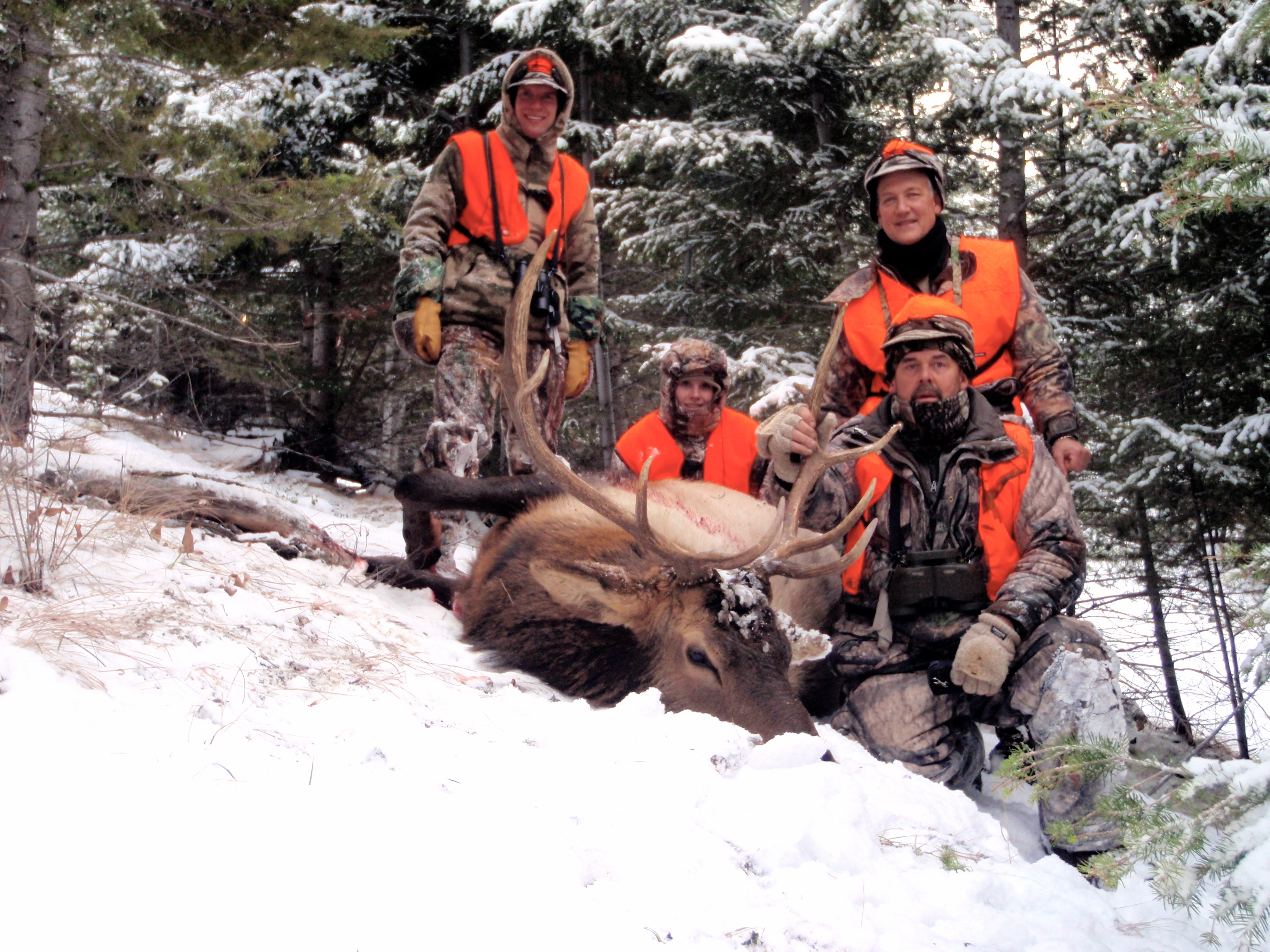 We froze and just sat there unmoving and trying to figure out what to do next. They were over 600 yards away and we all had our close range guns with us. We glassed the herd and saw lots of cows and spikes but there were a few shooter bulls in there as well. Bill decided he would sneak back behind us into some cover and then make the long stalk way back around the draw and come in above and behind the herd. We would sit still, watch and wait. At this point in the day it was getting windier and colder. We were on the point of a ridge where the wind was the strongest and we had already been out in the cold for 7 hours. We huddled together growing colder as the minutes ticked by. Over and hour passed before Bill made it to the ridge the elk were enjoying. The numb feeling that had started in my toes had slowly moved up my foot, then my heel and finally up my calf. I shivered constantly and was so excited to see Bill’s outline and orange show up on the horizon. I knew it was only a matter of minutes before he would have a shot at some elk. Having over 300 eyes watching you actually makes shooting a bull a lot more of a challenge when you are stalking up to them. Bill went painfully slow and was able to get within range without being seen but picking out a shooter bull in that huge herd was proving difficult. He could see the majority of the elk but there were lots of them over the ridge and in swells that he still couldn’t see. Eventually, the herd sensed danger and started moving. They headed right toward Bill and started filing past him, some within 10 yards. There were too many all around him. We headed up to the point here the elk would intersect the logging road and the Mountain Man went to an aspen patch that he knew from past experiences was in the path of the herd. Tristan and I headed up to where Bill was to see if he had gotten a shot. He had shot but it was a quick shot and he was headed to confirm he had missed as he expected. Tristan and I waited for him and as we stood on the hill amid a sea of elk tracks a shot from the aspen patch shattered the silence. We headed over to find the Mountain Man. He had a huge smile on his face and led us to a bull he had shot. They came through the aspens just like he said they would and a bull stopped long enough for the Mountain Man to put him down. Bill joined us shortly and confirmed his miss on the other elk. We all shared another round of congratulations and pictures.