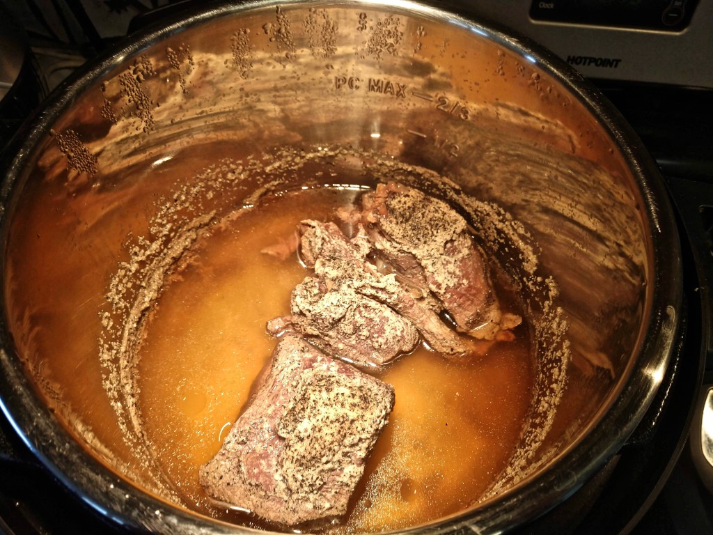 Place the roasts in an Instant Pot and add seasoning and 2 cups of water. Set the Instant Pot to pressure cook on high for 1 hour. Release the steam and add the veggies cut into chunks. Reset the pressure cooker for 10 minutes and then serve or let it slow cook on low until dinner! There is great broth in the bottom of this dish that I like to save and use later as a gravy base or for a soup.