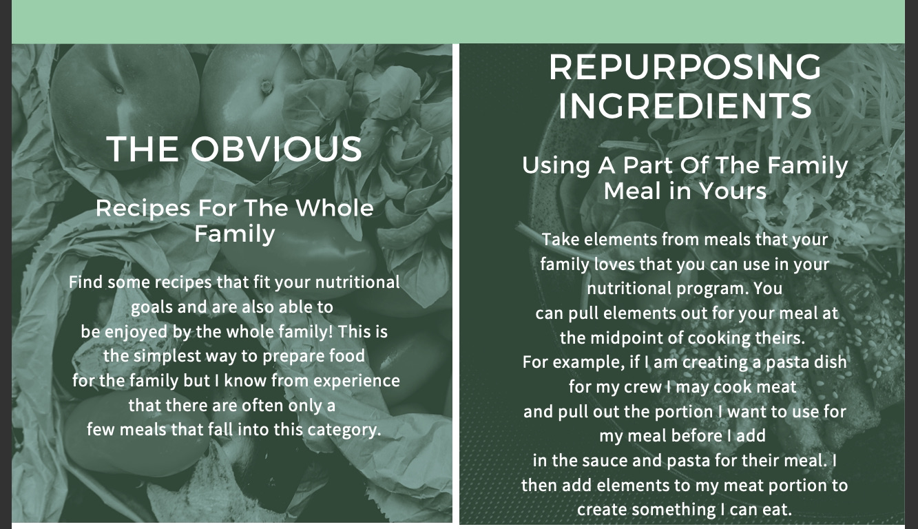 I am a wife and a mom to three great kiddos. I am busy with a job, taking care of the house, taking care of my family, my hunting and outdoor pursuits and many many things!  Usually when meal time hits it feels like something that has to be done and got through as quickly as possible so I can clean up and get on to the next thing on my list.  When life is hectic and you are the main cook for your family it can seem overwhelming to try to add your own nutritional needs into the mix. Everyone has their own nutritional needs and sometimes they can be quite complicated. I for example, have Hashimoto Thyroiditis and my body and hormones are healthier when I avoid some foods. As the main cook in the house, it can be difficult to feed a family meals that they love and still be able to stay within the guidelines that provide me optimal health. I don’t have time to cook two completely separate meals but over time I have realized that I really don’t have to. If I think ahead, I can usually use a few elements from the dinner I am making for my family and add a few other elements that fit into my nutrition program without it adding much work at all during mealtimes. I wanted to share a little of what I have learned along the way to hopefully save some time for those of you who are making the meals in your home while also trying to stick with a nutrition program that will help you reach your goals.